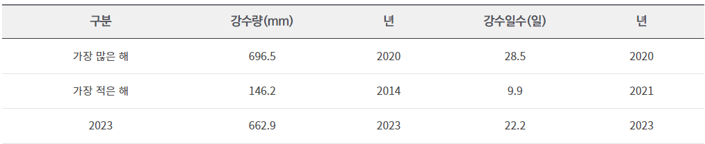 지난 2014년부터의 통계를 보면 강수량이 가장 많았던 시점은 2020년으로 강수일수는 28.5일에 달했으며 2021년이 9.9일로 가장 가뭄이 심했던 해로 기록되었습니다.